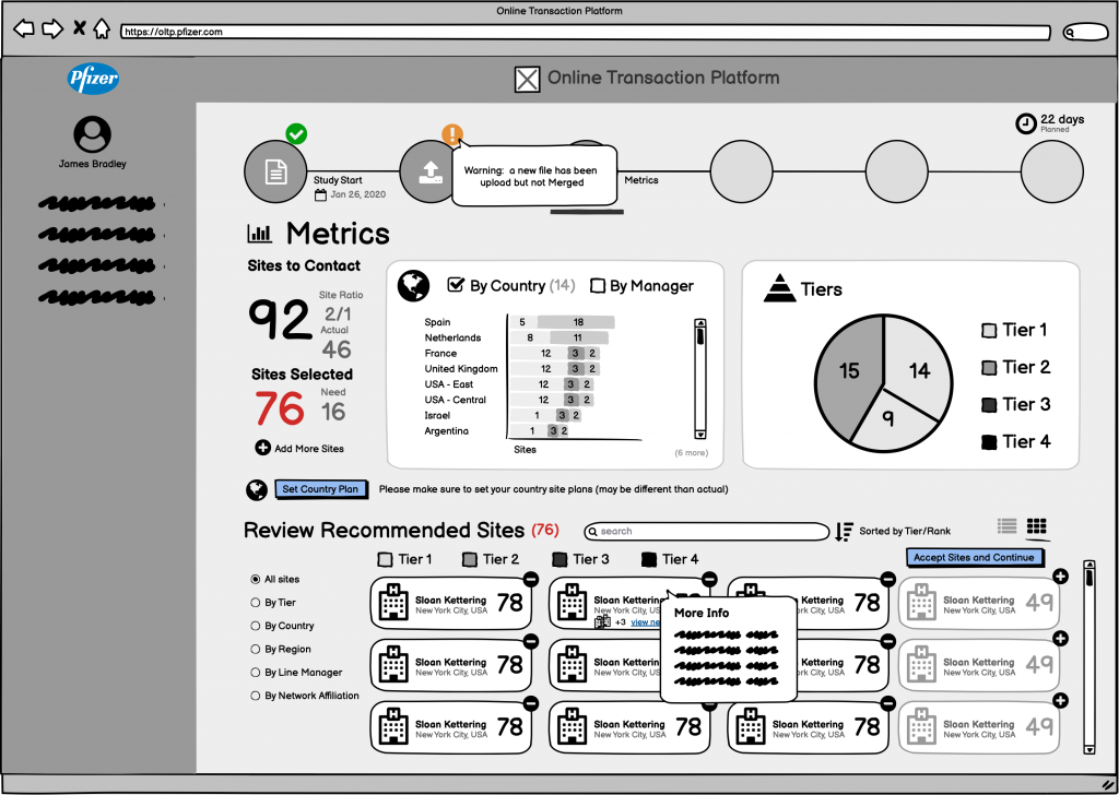 Performed fruitful user research and designed enterprise platform (in phases) that replaced manual clinical site selection with improved workflows and dashboards. We also automated many of the user’s tasks and some dashboards were powered by AI drastically reduced confusion in discrepancies of incomplete and/or inconsistent data from industry sources. Often, I introduced new features in the designs that surprised and delighted users and senior management. The newly designed platform provided improved efficiency and decision-making through streamlined UX dashboards and workflow; and integrated AI-driven data analysis.